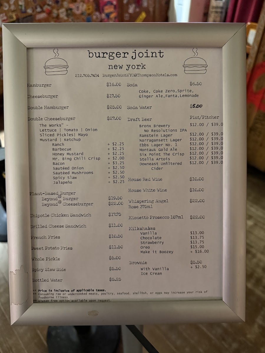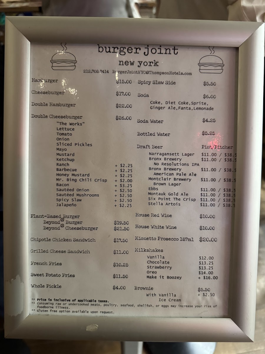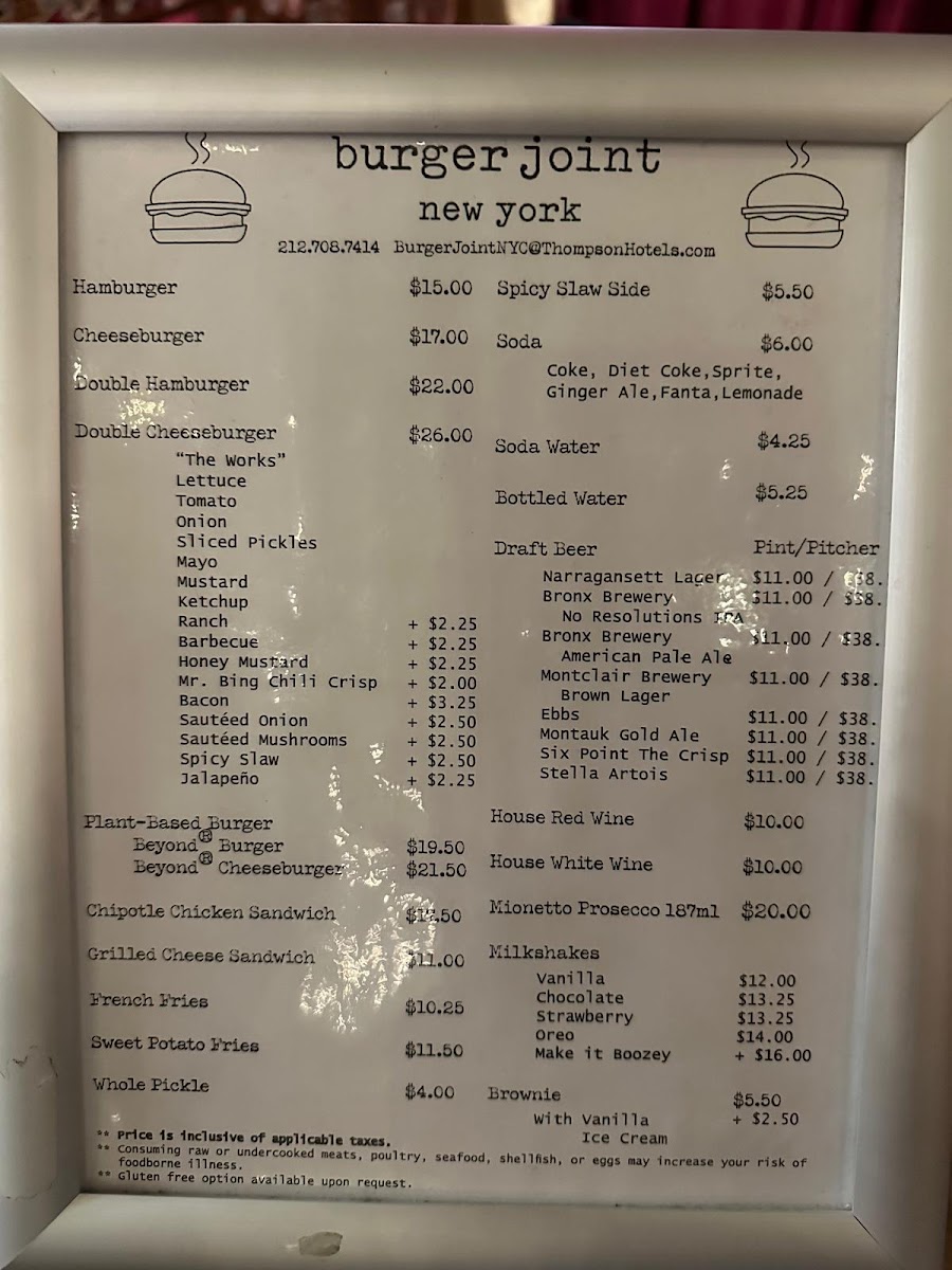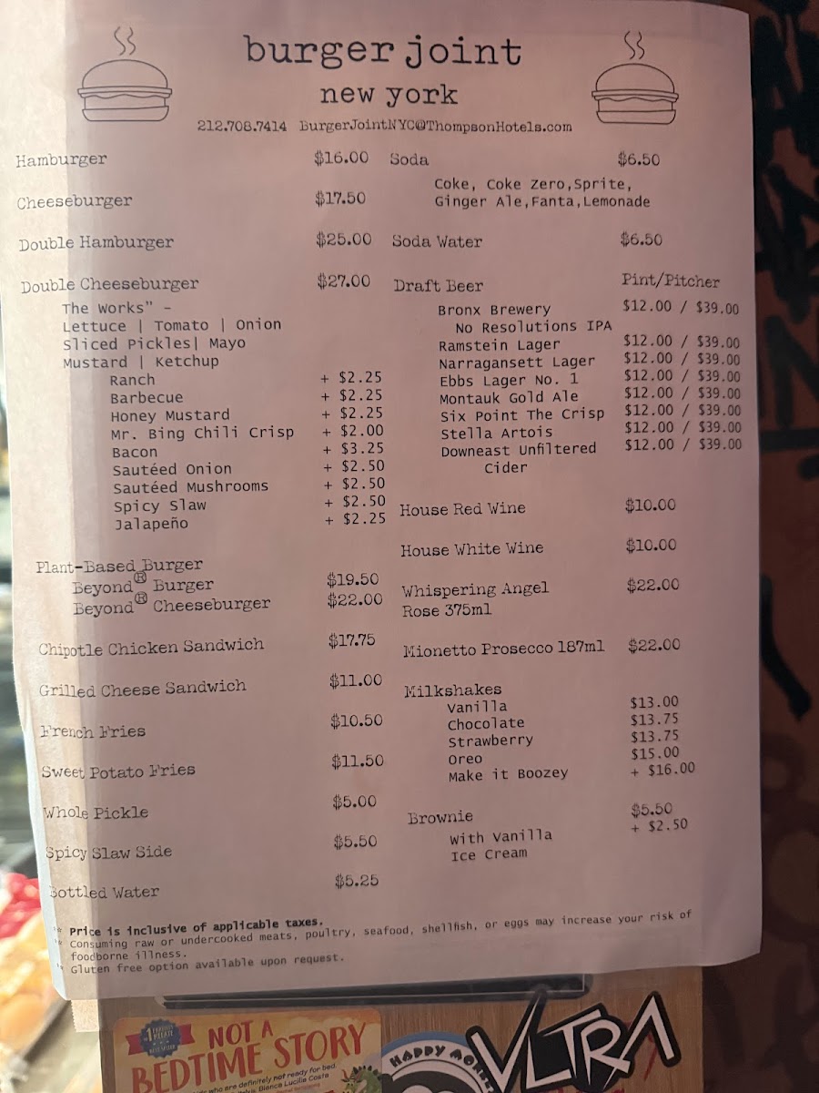 Features a playful burger graphic with toppings listed, including tomato, lettuce, onion, pickles, mayo, ketchup, mustard, and patty. Text reads "burger joint new york."