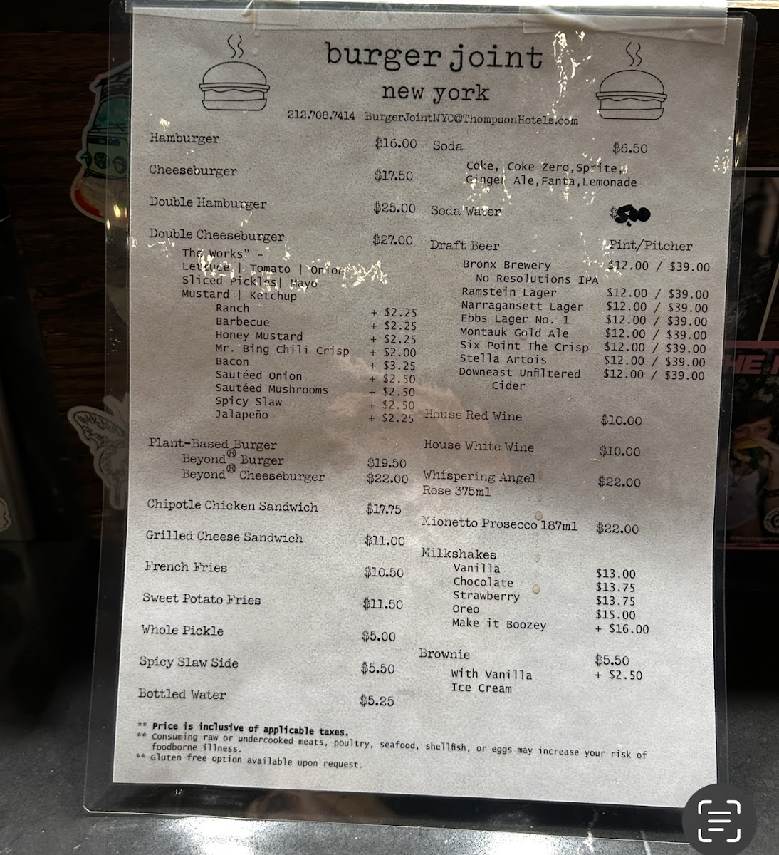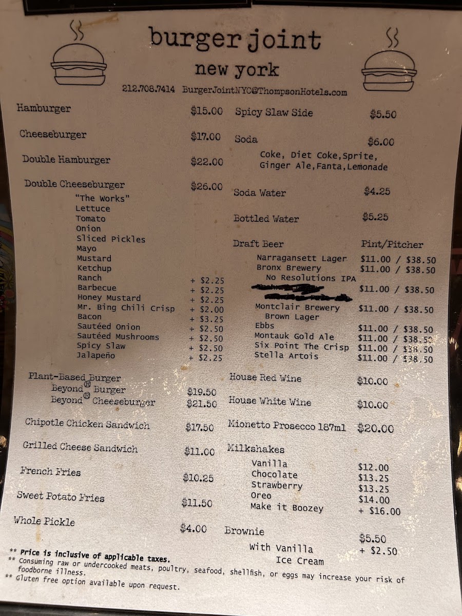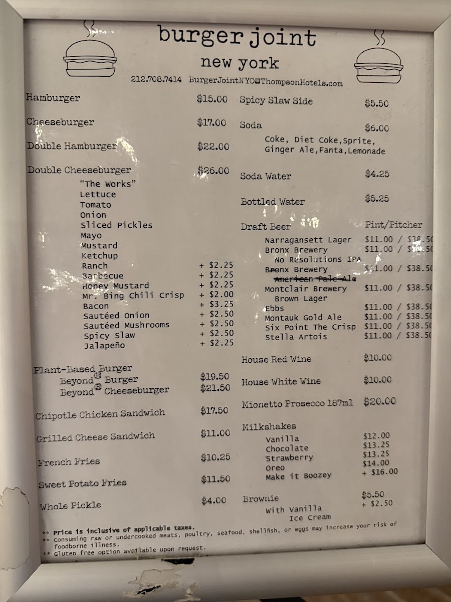 Features a playful burger graphic with toppings listed, including tomato, lettuce, onion, pickles, mayo, ketchup, mustard, and patty. Text reads "burger joint new york."